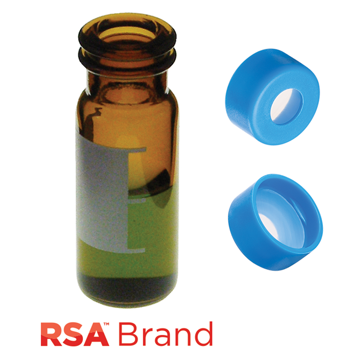 Vial & Cap Kit includes 100 EA 2ml, Snap Top, Amber RSA™ Autosampler Vials with Write-On Patch and fill lines and 100 EA matching Snap Caps with Silicone Rubber / PTFE, ultra-pure Septa, fitted in the Light Blue Caps. RSA Brand Easy Purchase Pack. 1 PK.