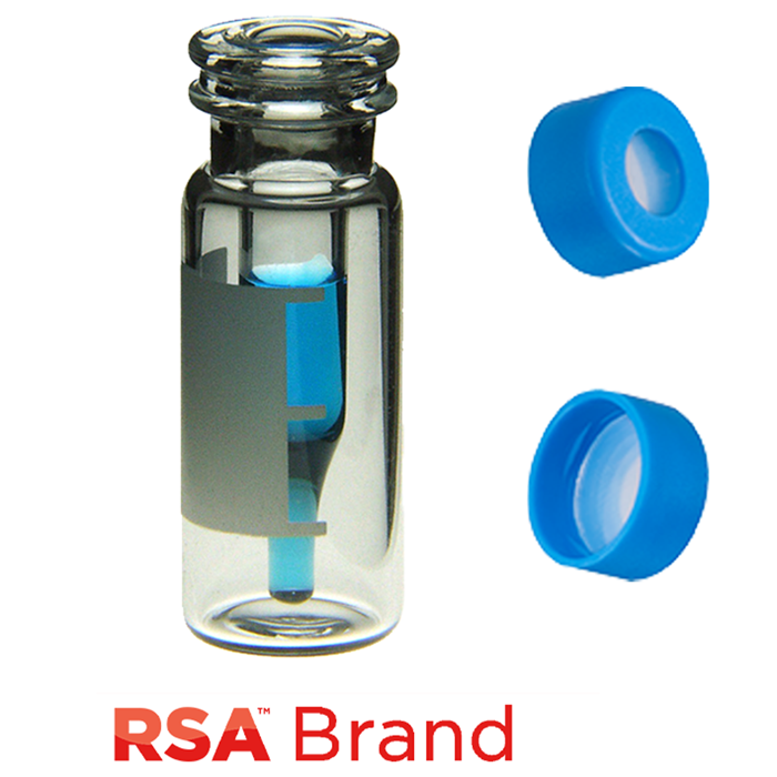 Vial & Cap Kit includes 100 EA 300ul, Fused Insert, Snap Top, Clear RSA™ Autosampler Vials with Write on Patch and fill lines and 100 EA matching Snap Caps with Clear AQR Silicone Rubber / Clear PTFE, ultra-pure Septa, fitted in the Light Blue Caps. RSA Brand Easy Purchase Pack. 1 PK.