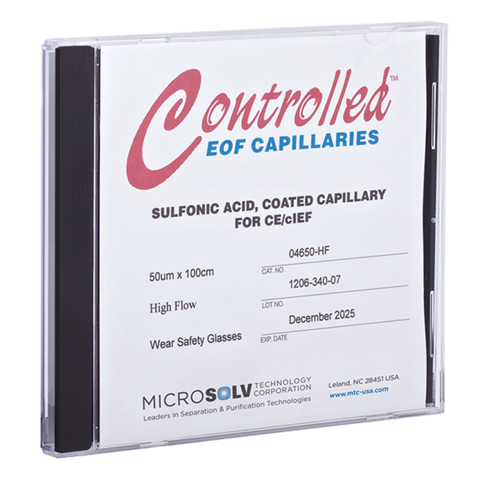 This fused silica capillary is clad with a polyimide outer coating. The inner capillary wall is covalently bonded with a polymer with Sulfonic Acid Groups to create a higher than normal negative charge environment that conducts more current and creates a faster than normal Electro-Osmotic Flow (EOF) than Bare Fused Silica Capillaries. Ionized analytes will move to the anode or cathode respectively in shorter times than on untreated Capillaries..