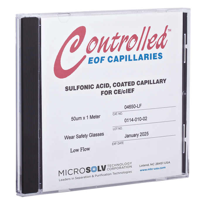 This fused silica capillary is clad with a polyimide outer coating. The inner capillary wall is covalently bonded with a polymer with Sulfonic Acid Groups to create a lower than normal negative charge environment that minimally conducts current and creates a much slower than normal Electro-Osmotic Flow (EOF). Ionized analytes will move to the anode or cathode respectively, in longer migration times than on untreated Bare Fused Silica Capillaries..