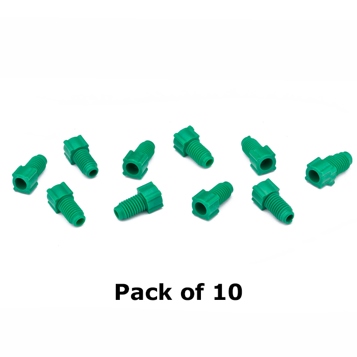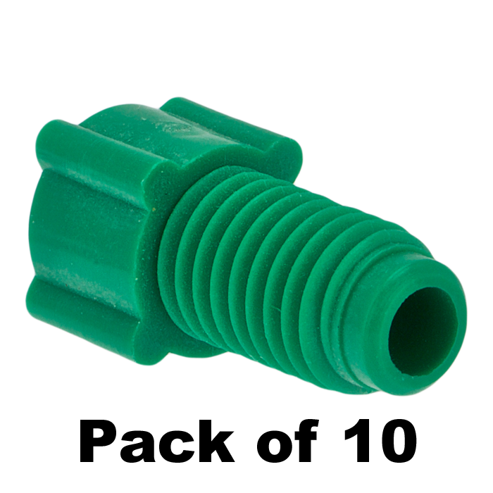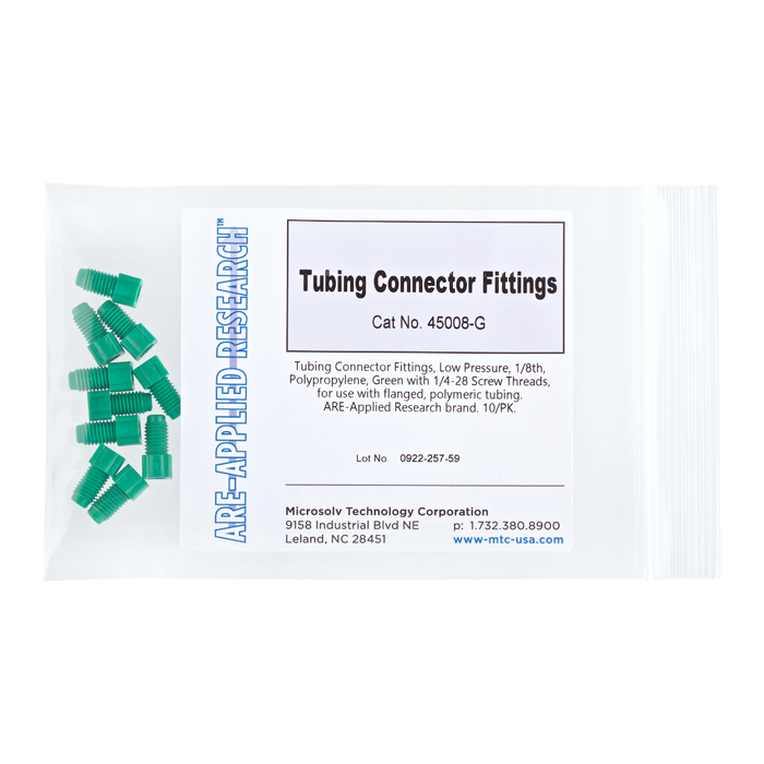 Tubing Connector Nuts, low pressure, 1/8 inch, Polypropylene, Green with 1/4-28 screw threads, for use with flanged, polymeric tubing. ARE-Applied Research brand. 10/PK.