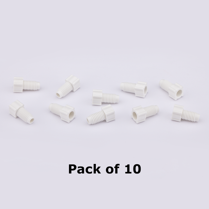 These tubing connector nuts are used to connect 1/8th inch (3.2 mm) polymeric tubing in the low pressures zones of HPLC systems and other low to medium pressure, fluidic uses.