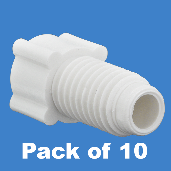 Tubing Connector Nuts, low pressure, 1/8 inch, Polypropylene, White with 1/4-28 screw threads, for use with flanged, polymeric tubing. ARE-Applied Research brand. 10/PK.