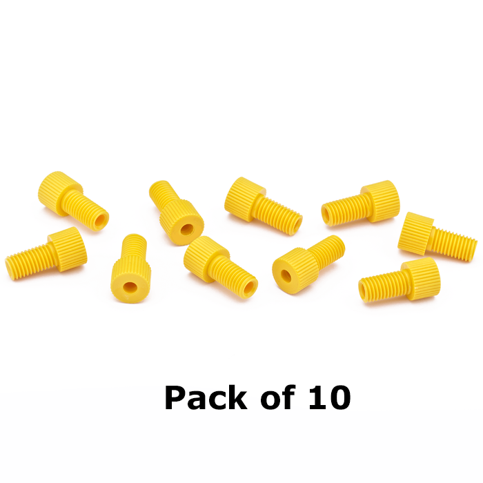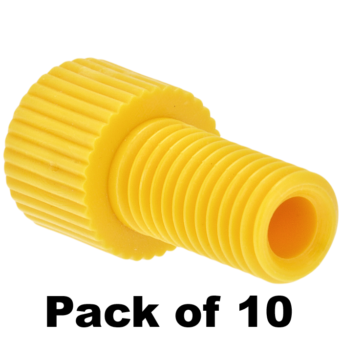 Tubing Connector Nuts, low pressure, 1/8 inch, Delrin, Yellow with 1/4-28 screw threads, for use with flange free, polymeric tubing. ARE-Applied Research brand. 10/PK.
