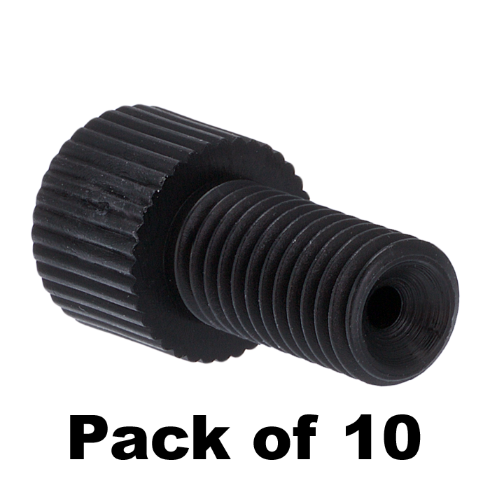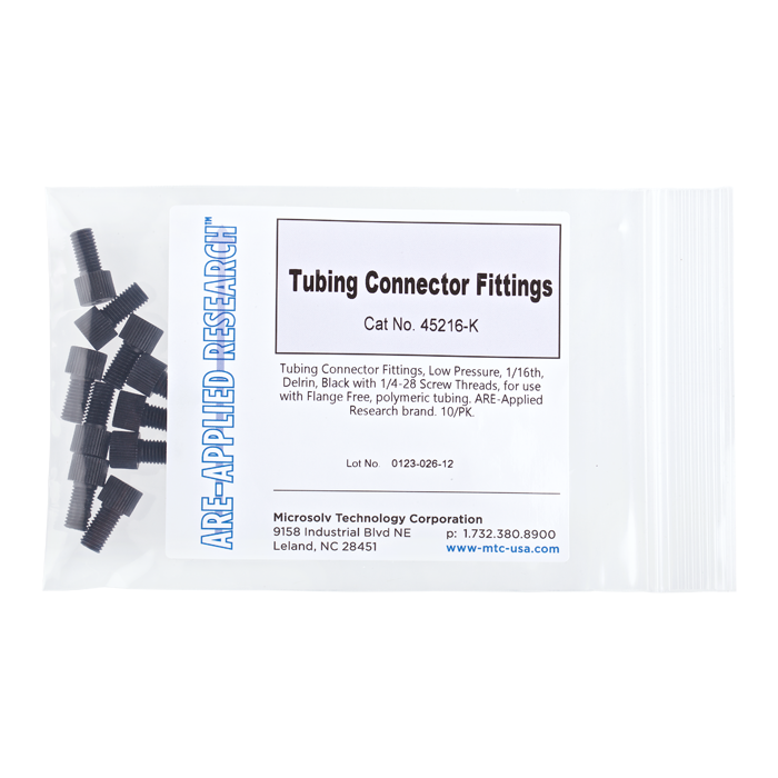 These hand tightened tubing connector nuts are used to connect 1/16th inch (1.6 mm) OD polymeric tubing in the low pressures zones of HPLC systems and other low pressure, fluidic uses.