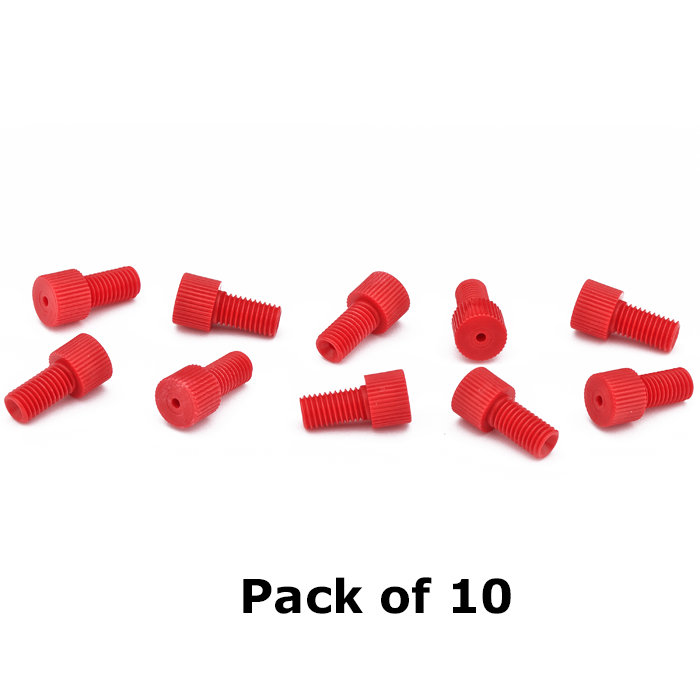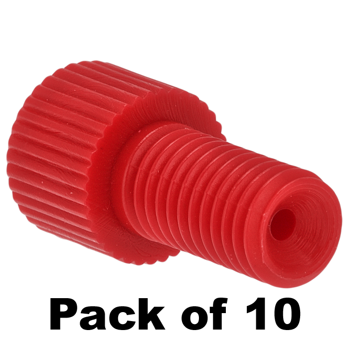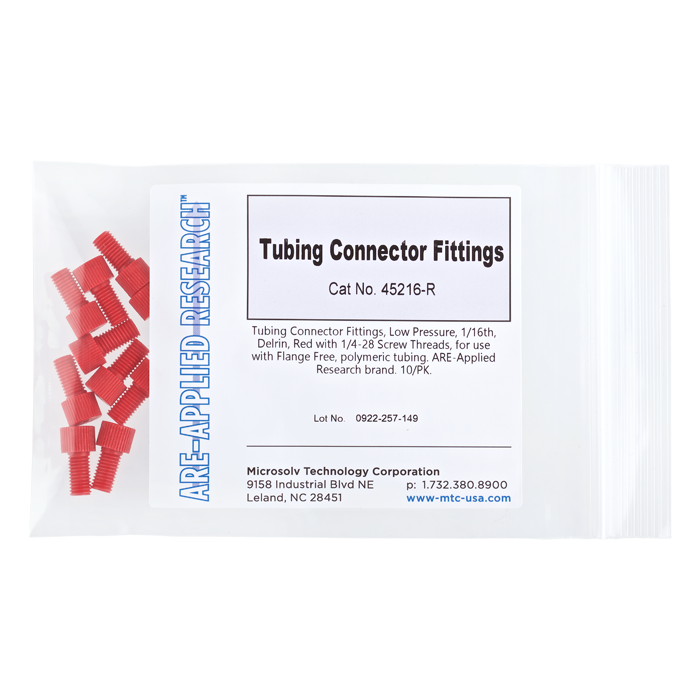 Tubing Connector Nuts, low pressure, 1/16 inch, Delrin, Red with 1/4-28 screw threads, for use with flange free, polymeric tubing. ARE-Applied Research brand. 10/PK.