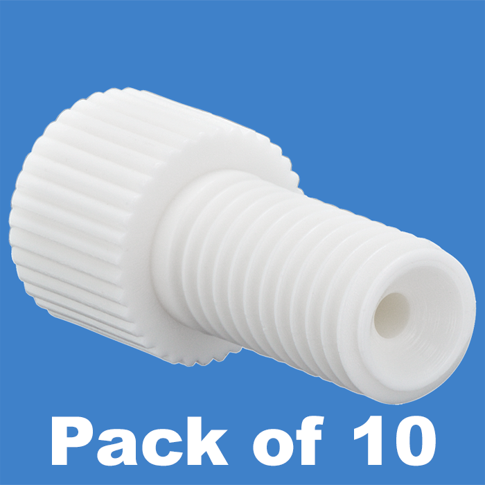 Tubing Connector Nuts, low pressure, 1/16 inch, Delrin, White with 1/4-28 screw threads, for use with flange free, polymeric tubing. ARE-Applied Research brand. 10/PK.