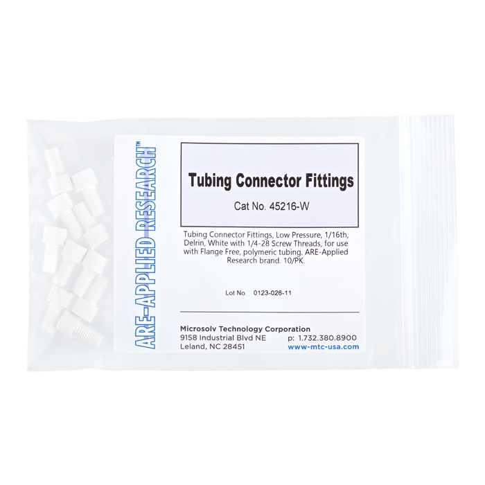 These tubing connector nuts are used to connect 1/16th inch (1.6 mm) OD polymeric tubing in the low pressures zones of HPLC systems and other low pressure, fluidic uses.