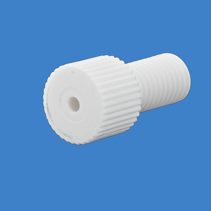 Delrin™ (Polyoxymethylene) material is an engineering thermoplastic used in precision parts requiring high stiffness, low friction, and excellent dimensional stability. It is excellent for use with HPLC solvents but is sensitive to both chlorine and acid hydrolysis.