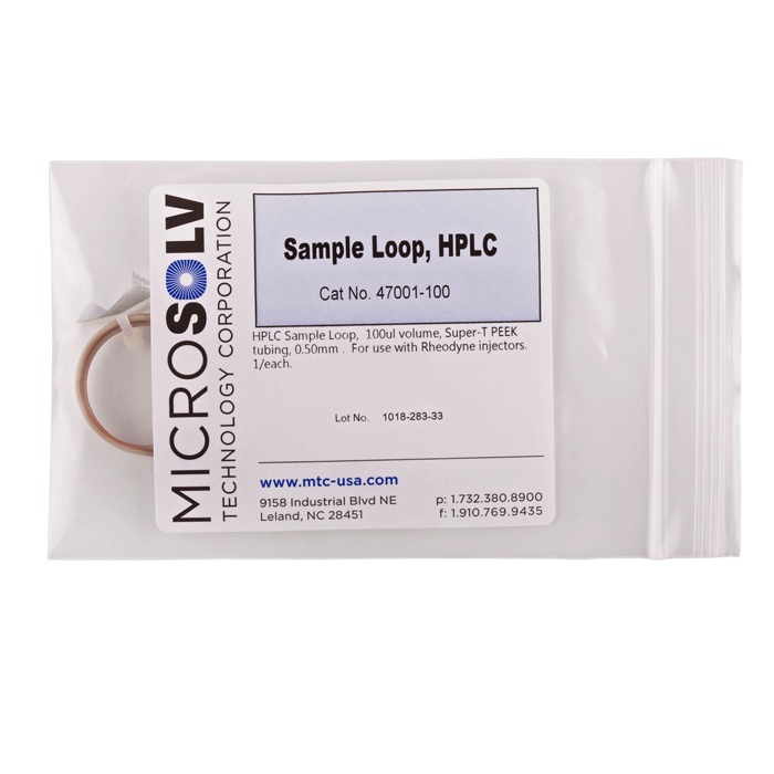 A label with the sample loop volume is attached. Use these loops with Rheodyne® or Cheminert® brands of injector valves.