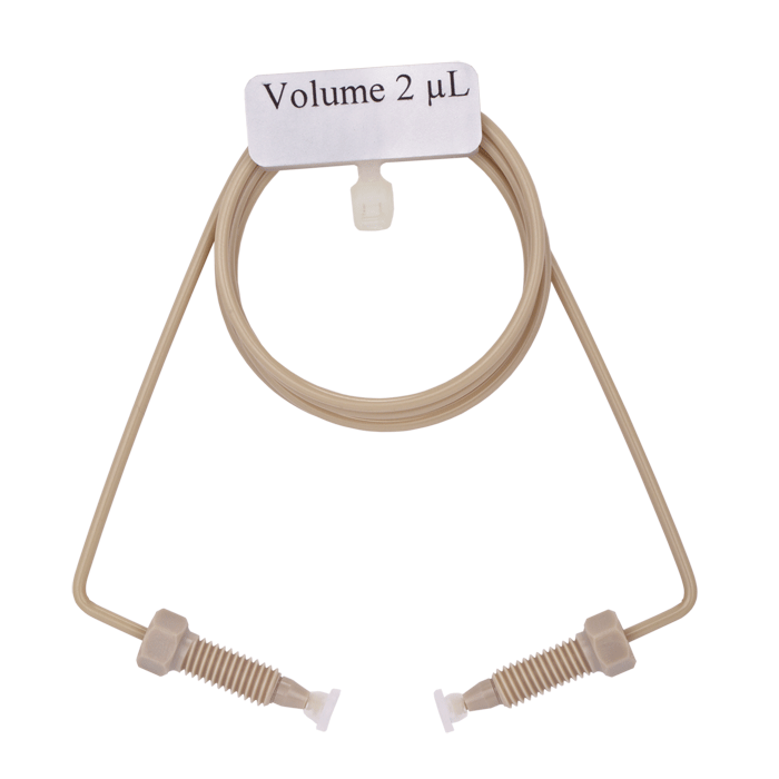 0.06 mm (+/- 0.025 mm) ID tubing is supplied with 2 high pressure, PEEK, three-piece, small hex head nuts with 1/32 inch threads and 2 special, single cone ferrules per nut to avoid twisting and turning of the sample loop. At the same time, the ferrules grip the tubing on two different places which increases the pressure stability of the connection. These fit the injectors and provide zero dead volume connections.