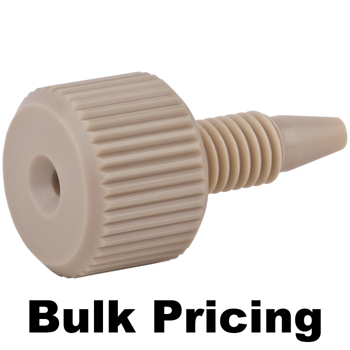 Tubing Connector Fittings, high pressure, one piece, 1/16 inch, PEEK, Natural, large head with 10-32 screw threads. Finger tighten, ARE-Applied Research brand. Bulk Price.