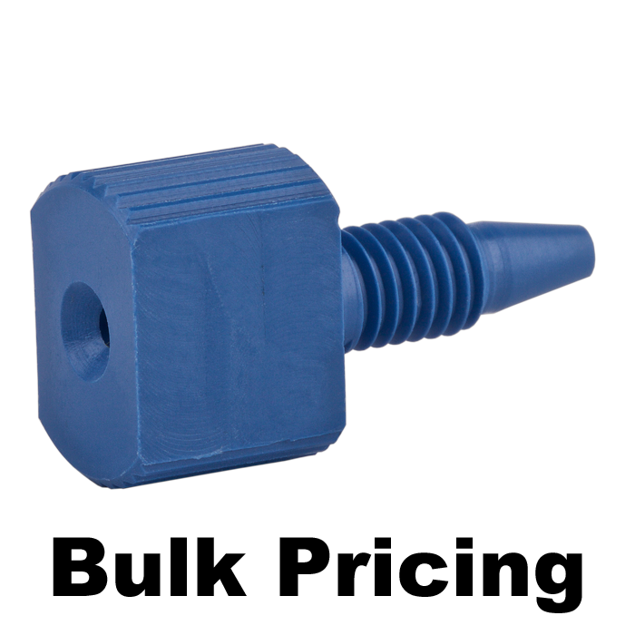Tubing Connector Fittings, high pressure, one piece, 1/16 inch, PEEK, Blue, large Combihead with 10-32 screw threads. Finger or wrench tighten, ARE-Applied Research brand. 1 EA.