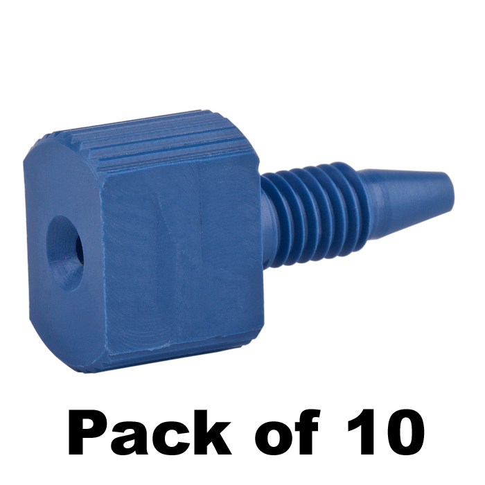 Tubing Connector Fittings, high pressure, one piece, 1/16 inch, PEEK, Blue, large Combihead with 10-32 screw threads. Finger or wrench tighten, ARE-Applied Research brand. 10/PK.