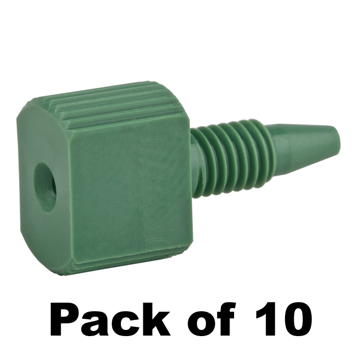 Tubing Connector Fittings, high pressure, one piece, 1/16 inch, PEEK, Green, large Combihead with 10-32 screw threads. Finger or wrench tighten, ARE-Applied Research brand. 10/PK.