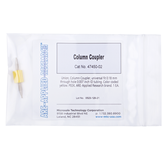 Union, Column Coupler, universal fit 0.18 mm through hole 0.007 inch ID tubing. Color coded yellow. PEEK. ARE-Applied Research brand. 1 EA.