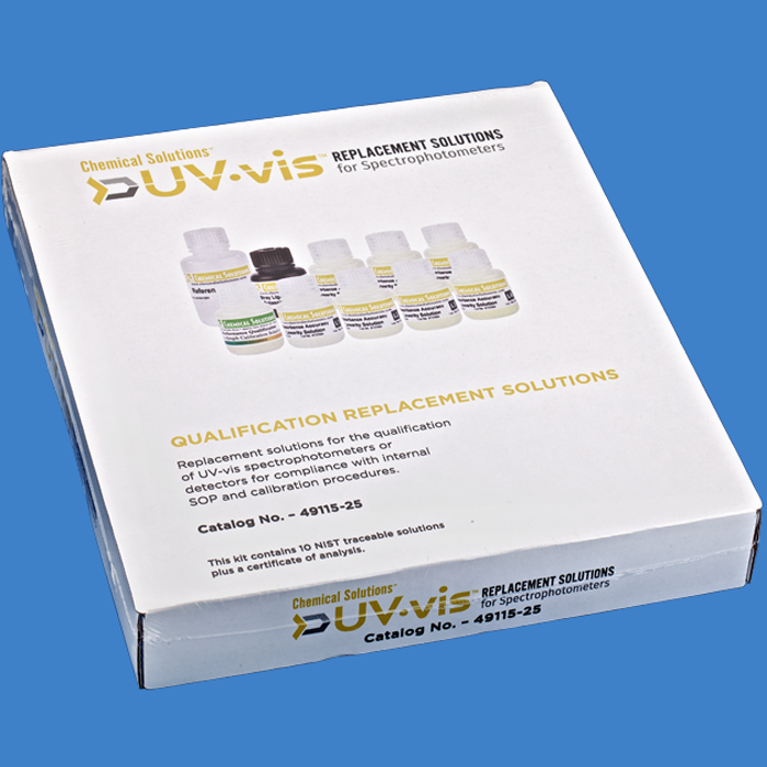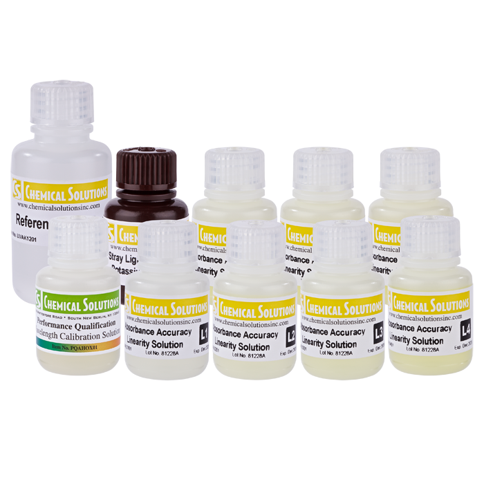 This set of NIST traceable solutions are replacements for use with the Chemical Solutions UV-vis Calibration Kit™ for performance qualification (PQ) of UV or UV-vis spectrophotometers and detectors.
