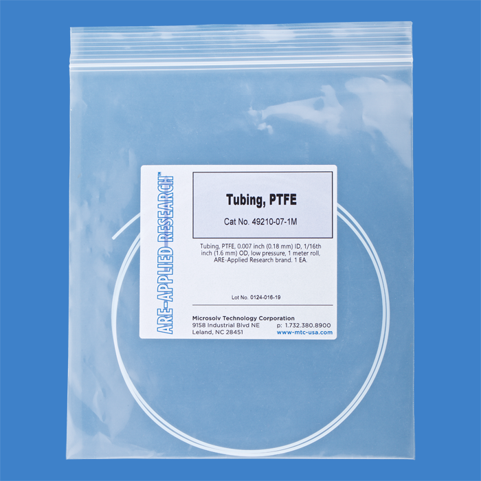 Tubing, PTFE, 0.007 inch (0.18 mm) ID, 1/16th inch (1.6 mm) OD, low pressure, 5 meter roll, ARE-Applied Research brand. 1 EA.