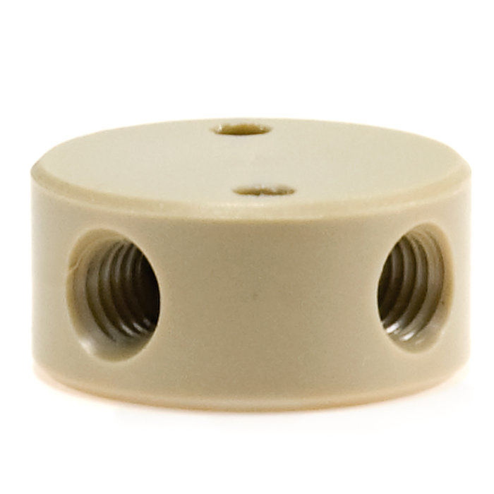 Union, Connector Kit, Cross, high pressure, 0.30 mm / 0.012 inch through hole with 10-32 screw threads. PEEK, round with an internal "X" flow pattern. Use with 1/16 inch tubing. ARE-Applied Research brand. Bulk Price.