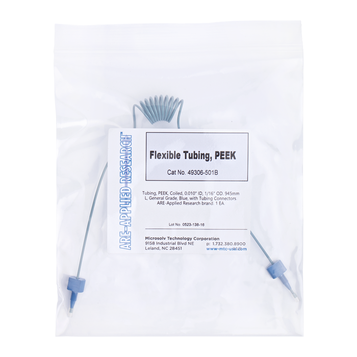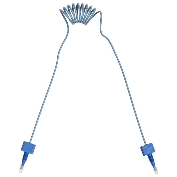 Tubing, PEEK, Coiled, 0.010 (0.25 mm) ID, 1/16th inch (1.6 mm) OD. 945 mm length, HPLC grade, solid blue, with tubing connectors. ARE-Applied Research brand. 1 EA.