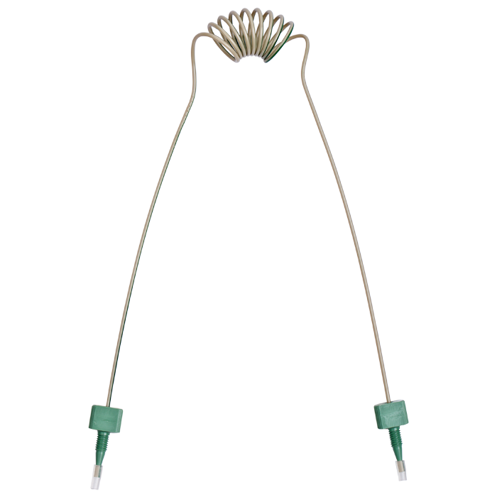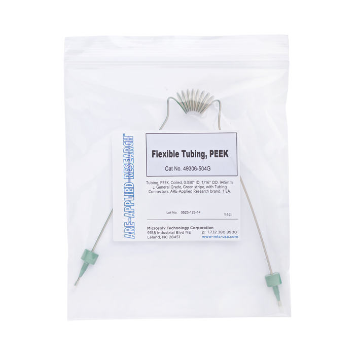 Tubing, PEEK, Coiled, 0.030 (0.75 mm) ID, 1/16th inch (1.6 mm) OD. 945 mm length, HPLC grade, green stripe, with tubing connectors. ARE-Applied Research brand. 1 EA.