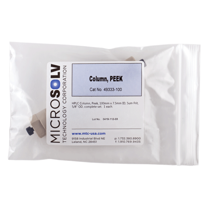 HPLC Column Set, PEEK with a 7.5 mm ID. Includes, a 100 mm x 7.5 mm black, column body tube plus 2 PEEK 5 um frits, 2 frit spacers & 2 end fittings. ARE-Applied Research brand. 1 EA.