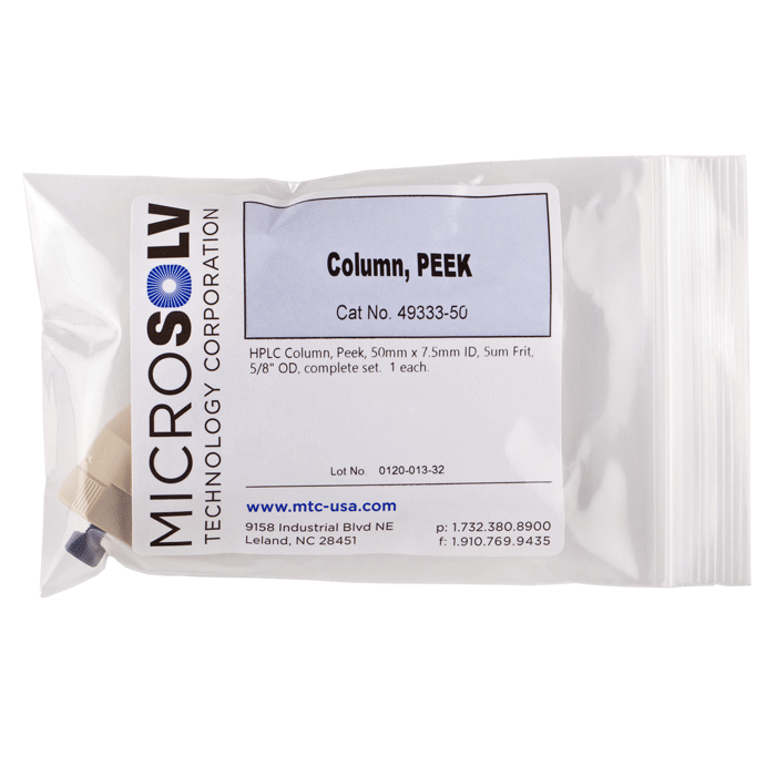 HPLC Column Set, PEEK with a 7.5 mm ID. Includes, a 50 mm x 7.5 mm black, column body tube plus 2 PEEK 5 um frits, 2 frit spacers & 2 end fittings. ARE-Applied Research brand. 1 EA.