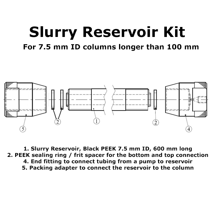 Slurry Reservoir Kit, All-PEEK, for packing 7.5 mm ID columns that are greater than 100 mm in length. Reservoir is 600 mm long with a 7.5 mm ID, complete with all parts and accessories needed to pack bioinert, All-PEEK columns. ARE-Applied Research brand. 1 EA.