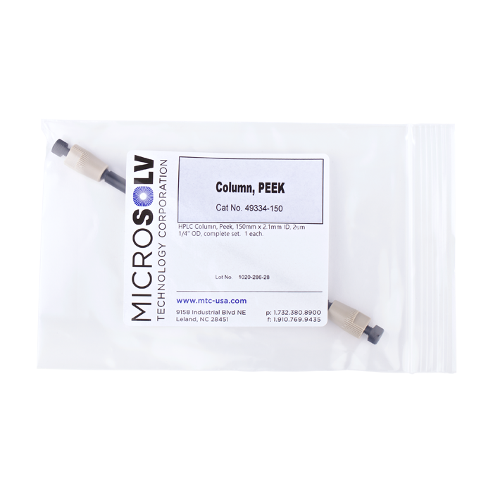HPLC Column Set, PEEK with a 2.1 mm ID. Includes, a 150 mm x 2.1 mm black, column body tube plus 2 PEEK 2 um frits & 2 end fittings. ARE-Applied Research brand. 1 EA.