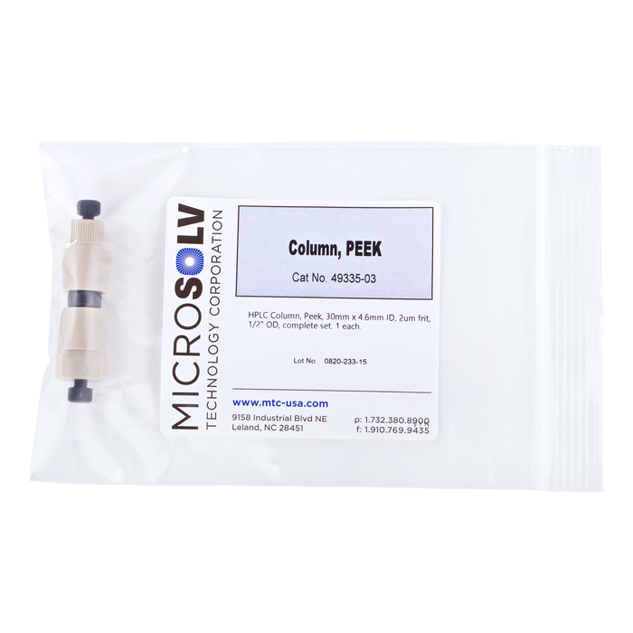 HPLC Column Set, PEEK with a 4.6 mm ID. Includes, a 30 mm x 4.6 mm black, column body tube plus 2 PEEK 2 um frits & 2 end fittings. ARE-Applied Research brand. 1 EA.