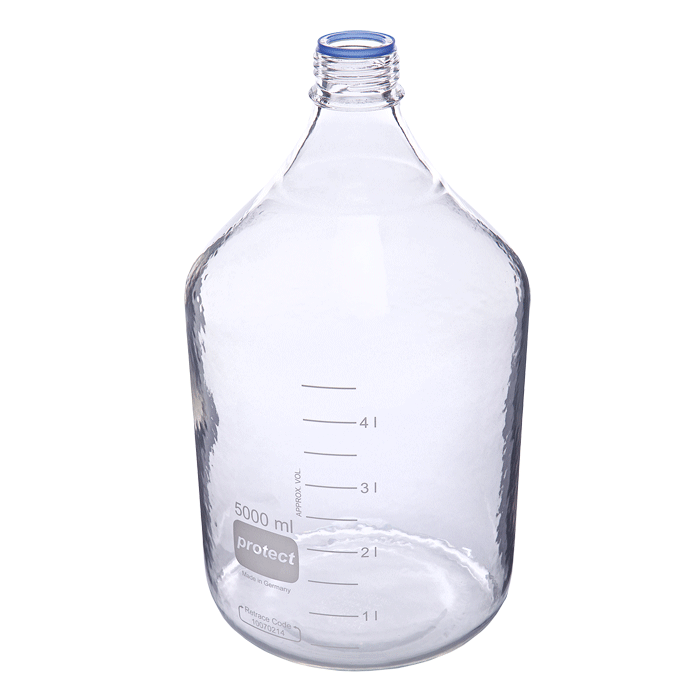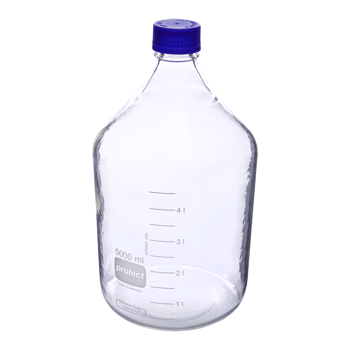This Clear, Plastic Coated, Borosilicate Glass Bottle has a 5L "Total Fill Capacity" and is perfect as an HPLC Mobile Phase Reservoir. The small opening, Large Capacity and Enamel Graduations on the outside of the Bottle help you determine the Solvent use and prevent running dry.