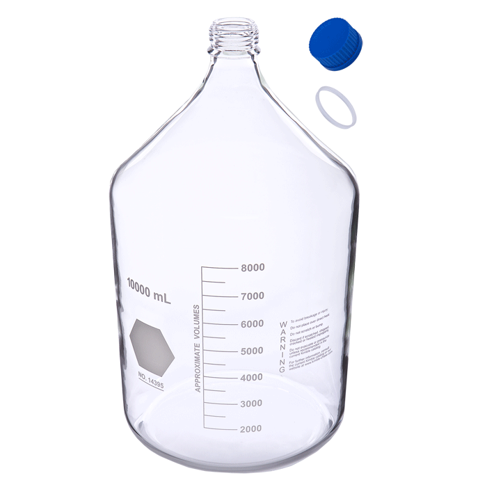This Clear, Plastic Coated, Borosilicate Glass Bottle has a 10L "Total Fill Capacity" and is perfect as an HPLC Mobile Phase Reservoir. The small opening, Large Capacity and Enamel Graduations on the outside of the Bottle help you determine the Solvent use and prevent running dry.