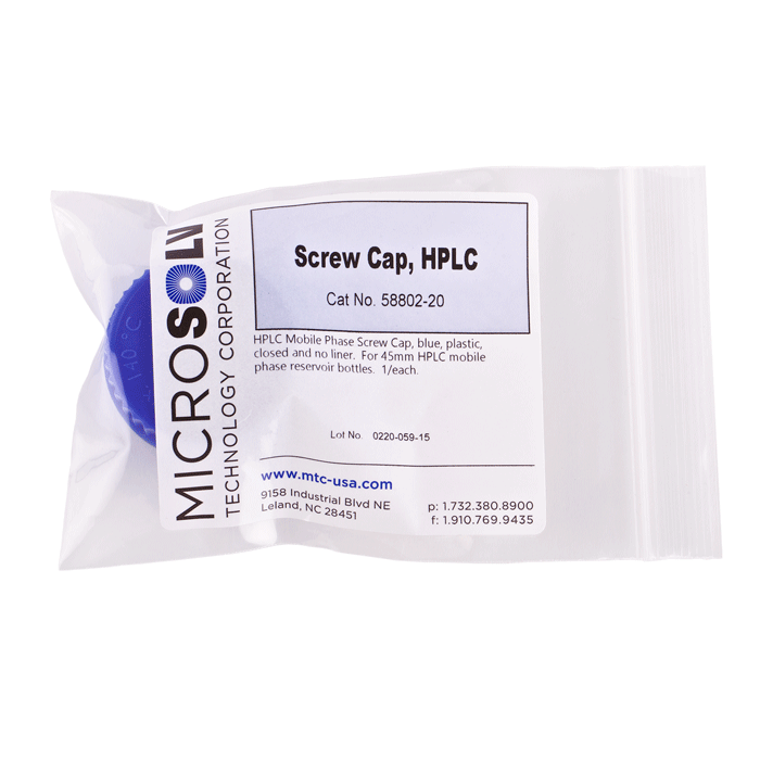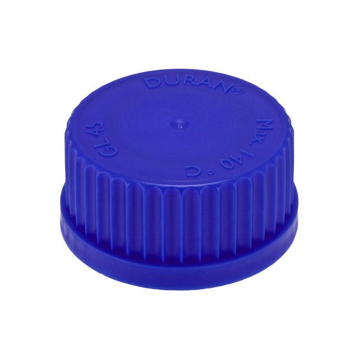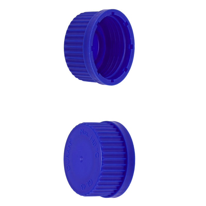 This cap is made of Polypropylene and has GL45 threads making it a good choice for Mobile Phase Reservoir Bottles when the bottle is empty to prevent dust and dirt from entering it.