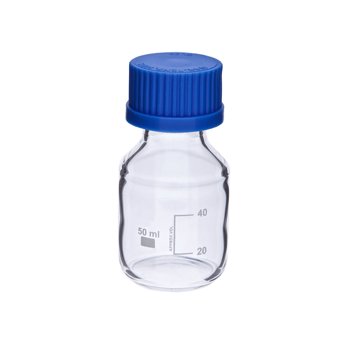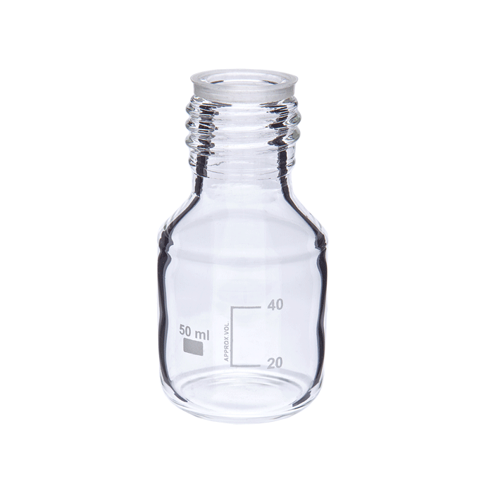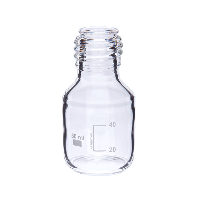 These Clear, Borosilicate Glass Bottles have a 50ml "Total Fill Capacity" and are perfect as HPLC Mobile Phase Storage Bottles. The small openings and Enamel Graduations and Marking Patches makes them a convenient way to store concentrated Mobile Phase or its Ingredients.