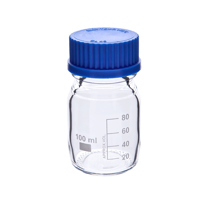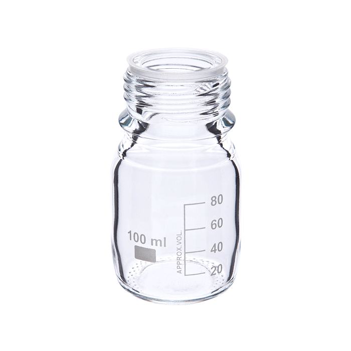This Clear, Borosilicate Glass Bottle has a 100ml "Total Fill Capacity" and is perfect as an HPLC Mobile Phase Storage Bottle. The small opening and Enamel Graduations and Marking Patch makes this a convenient way to store concentrated Mobile Phase or its Ingredients.