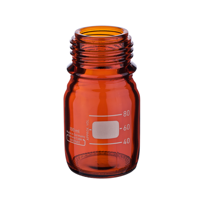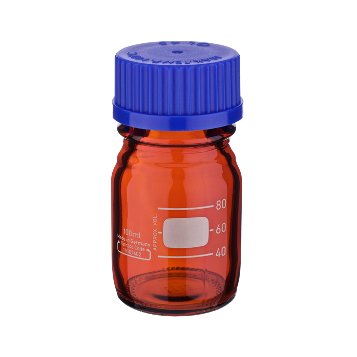 This Amber, Borosilicate Glass Bottle has a 100ml "Total Fill Capacity" and is perfect as an HPLC Mobile Phase Storage Bottle. The small opening and Enamel Graduations and Marking Patch makes this a convenient way to store concentrated Mobile Phase or its Ingredients.