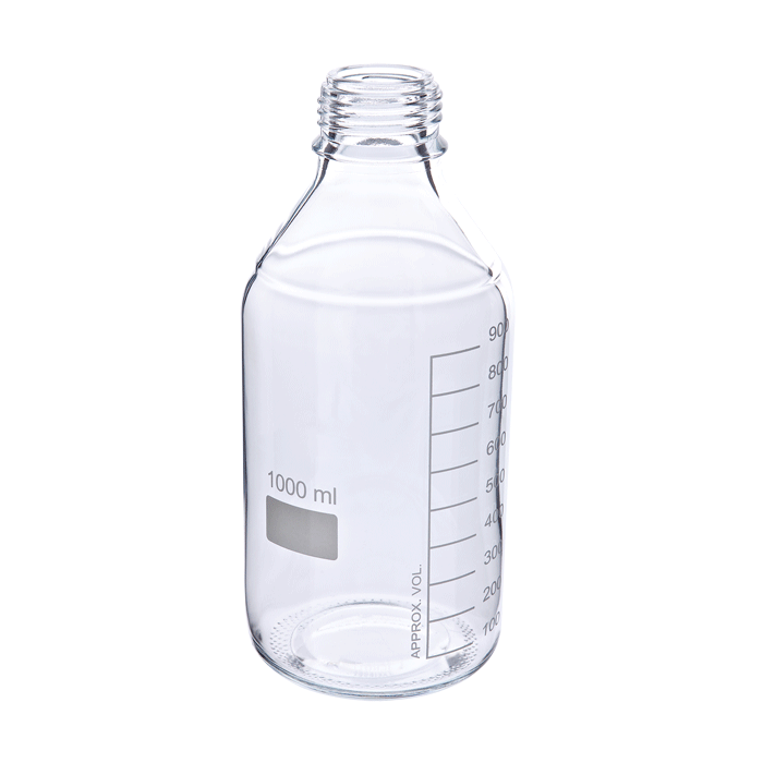 This Clear, Borosilicate Glass Bottle has a 1L "Total Fill Capacity" and is perfect as an HPLC Mobile Phase Reservoir. The small opening, one liter Capacity and White Enamel Graduations on the outside of the Bottle help you determine the Solvent use and prevent running dry.