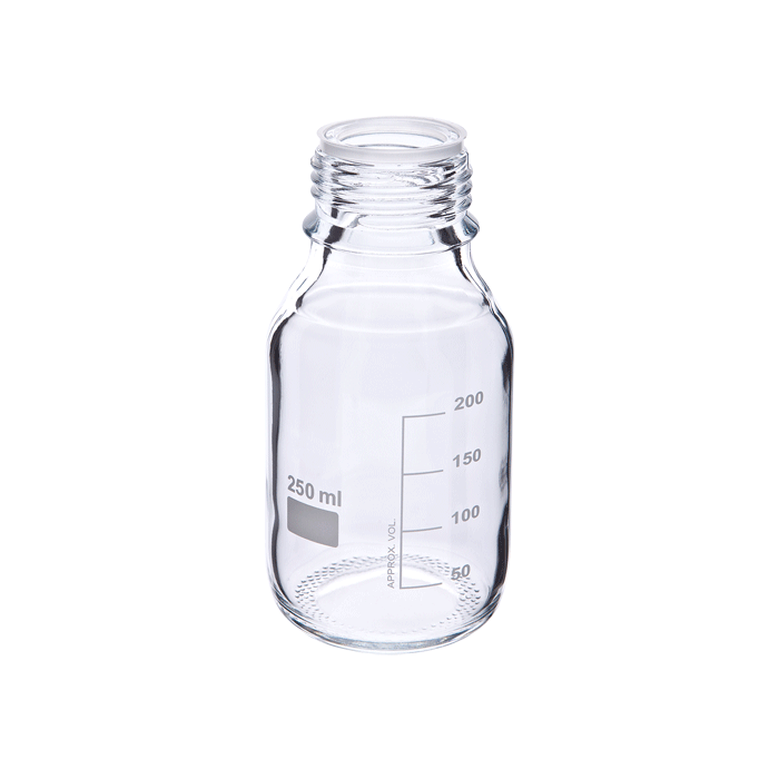 This Clear, Borosilicate Glass Bottle has a 250ml "Total Fill Capacity" and is perfect as an HPLC Mobile Phase Storage Bottle. The small opening and Enamel Graduations and Marking Patch makes this a convenient way to store concentrated Mobile Phase or its Ingredients.