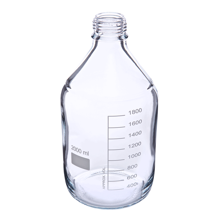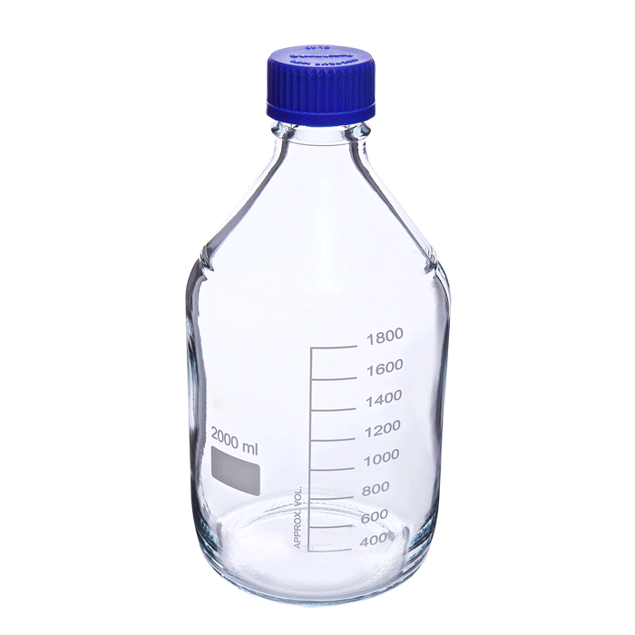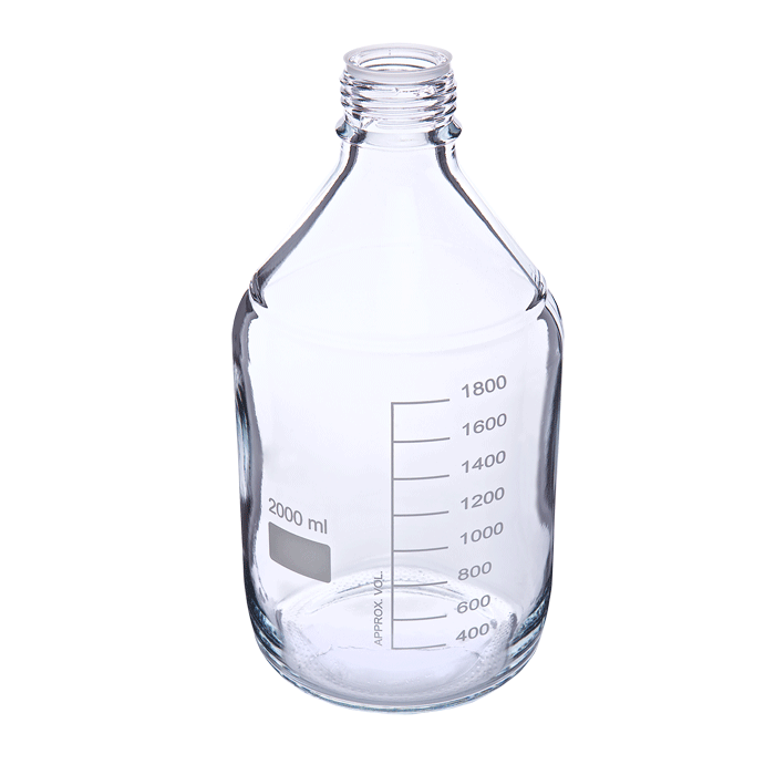 One of our Most Popular Items, this Clear, Borosilicate Glass Bottle has a 2L "Total Fill Capacity" and is perfect as an HPLC Mobile Phase Reservoir. The small opening, one liter Capacity and White Enamel Graduations on the outside of the Bottle help you determine the Solvent use and prevent running dry.