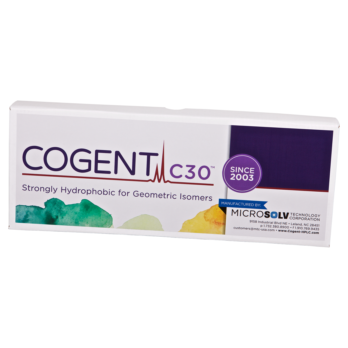 This Cogent C30™ Stationary Phase has been a premium value and used by HPLC laboratories for many years. Not end capped, it is manufactured with traditional bonding of a ligand that has an average length of 30 carbons to the highest purity silica available, making this column ideal as an Alternate in USP Methods that use the L62 Classification or for new methods.