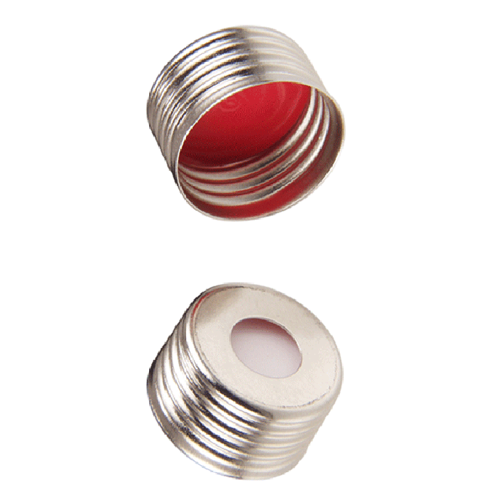Caps, Headspace, Screw Top, with White Silicone Rubber / Red PTFE Septa, fitted in Steel, Magnetic, Silver Caps with 8mm center holes. For use with 18mm Precision Thread Headspace Vials. MicroSolv Brand. 1000/CS.