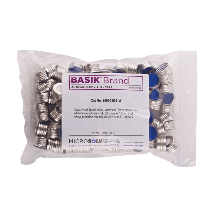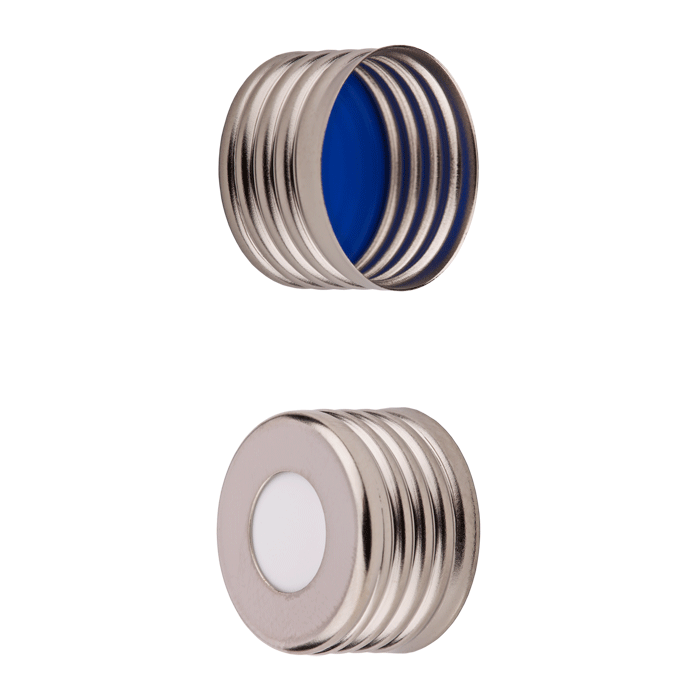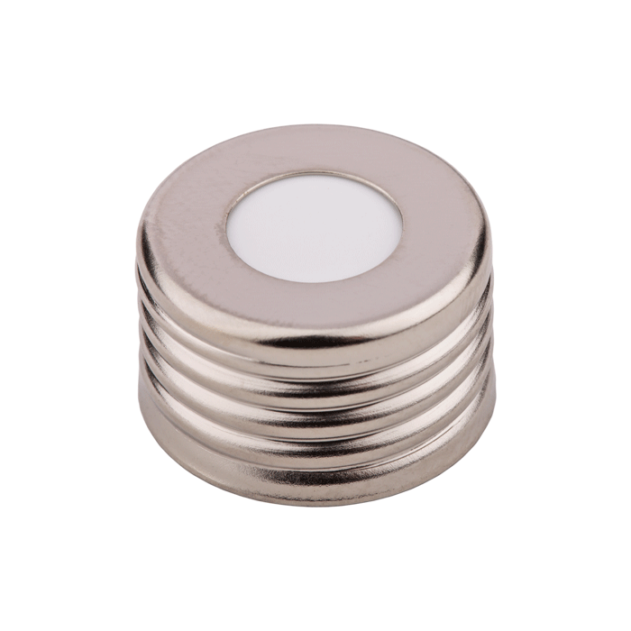 Caps, Headspace, Screw Top, with White Silicone Rubber / Blue PTFE Septa, fitted in Steel, Magnetic, Silver Caps with 8mm center holes. For use with 18mm Precision Thread Headspace Vials. BASIK Brand. 100/PK.