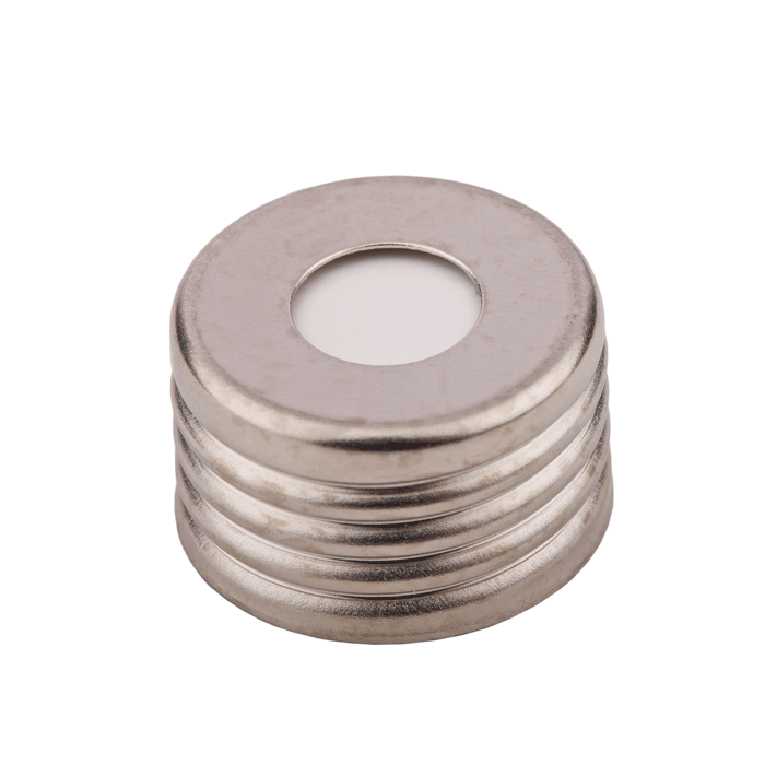 Caps, Headspace, Screw Top, with White Silicone Rubber / Blue PTFE Temperature Resistant Septa, fitted in Steel, Magnetic, Silver Caps with 8mm center holes. For use with 18mm Precision Thread Headspace Vials. MicroSolv Brand. 100/PK.