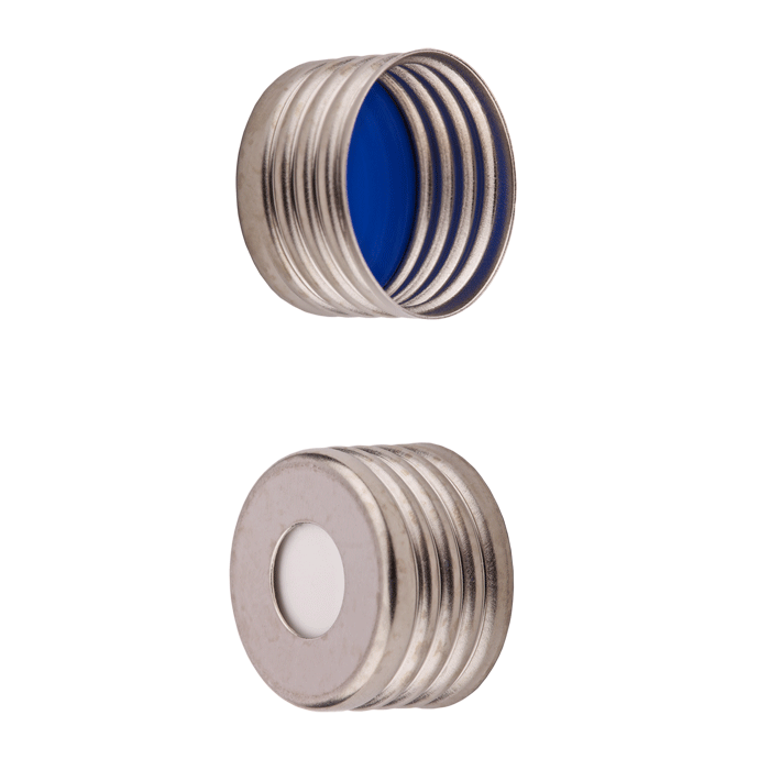Caps, Headspace, Screw Top, with White Silicone Rubber / Blue PTFE Temperature Resistant Septa, fitted in Steel, Magnetic, Silver Caps with 8mm center holes. For use with 18mm Precision Thread Headspace Vials. MicroSolv Brand. 1000/CS.