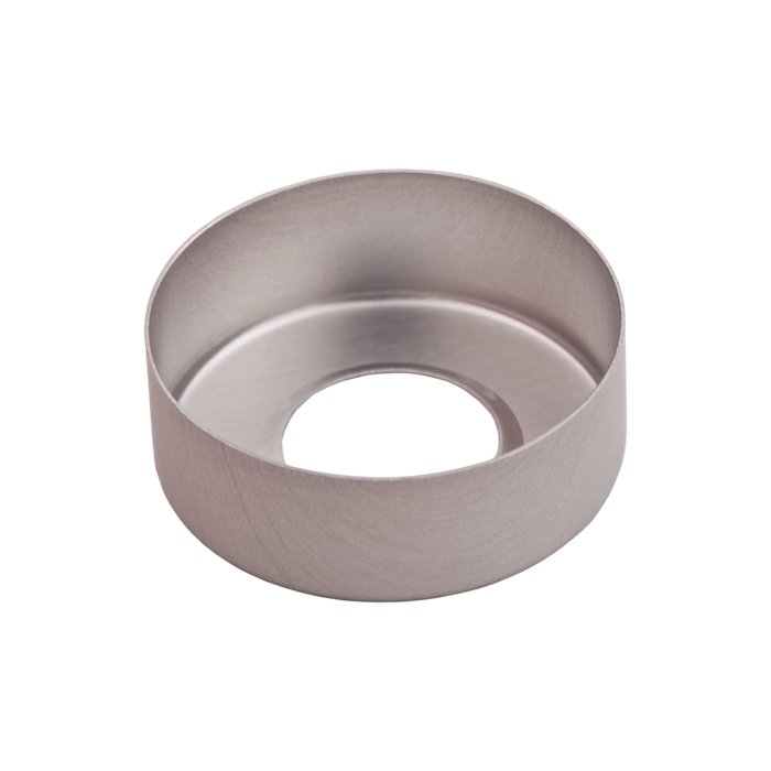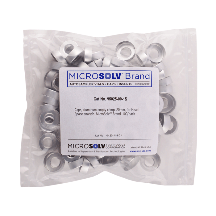 Caps, Headspace, Crimp Top, with an Open Hole. Aluminum Silver Caps. Septa are sold separately. For use with 20mm Crimp Top Headspace vials. MicroSolv Brand. 100/PK.