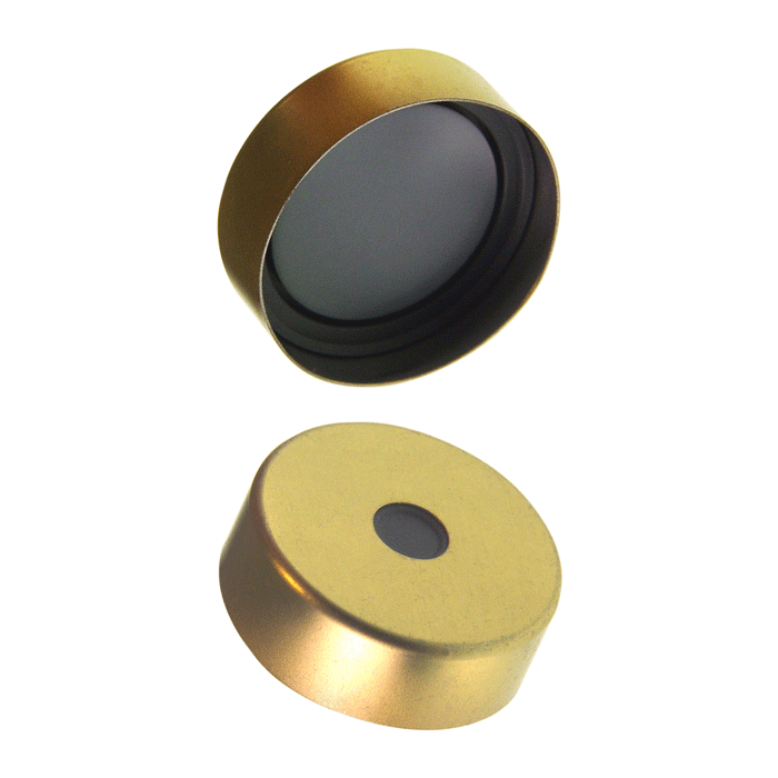 Caps, Headspace, Crimp Top, with Grey Butyl Rubber / Partially Laminated PTFE Septa, fitted in Steel, Gold Caps with 5mm center holes. Pharma-Fix. For use with 20mm Crimp Top Headspace Vials. MicroSolv Brand. 100/PK.