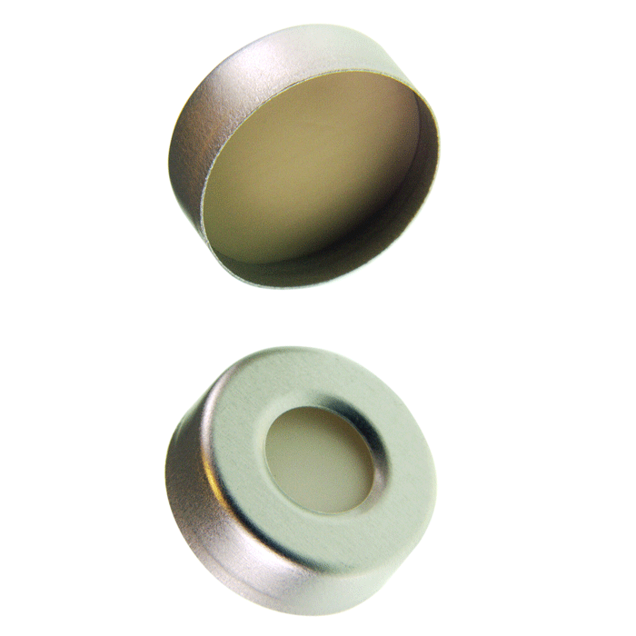 Caps, Headspace, Crimp Top, with White Silicone Rubber / Natural Beige PTFE Septa, fitted in Aluminum, Silver Caps with 10mm center holes. For use with 20mm Crimp Top Headspace Vials. BASIK Brand. 100/PK.
