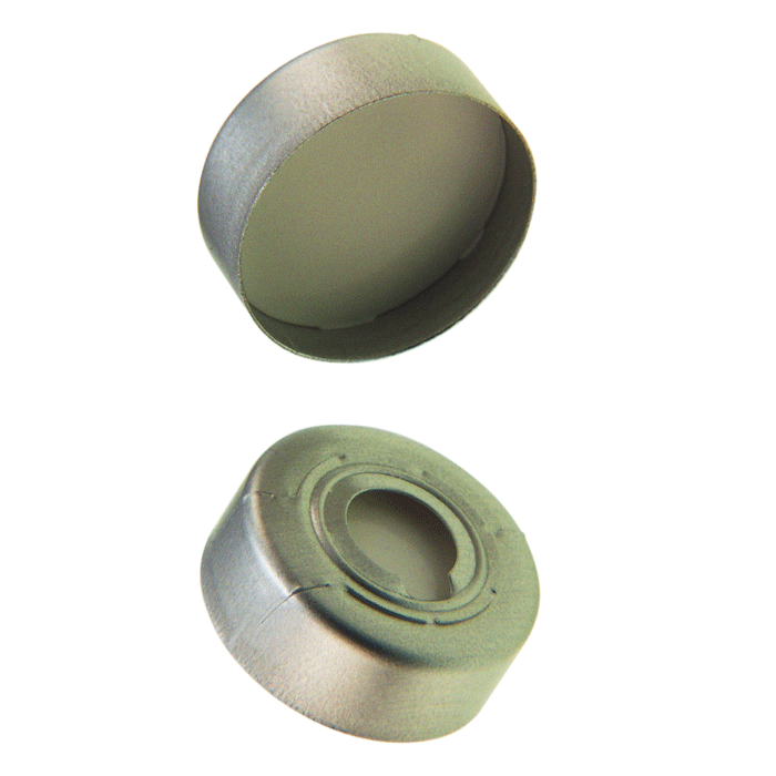 Caps, Headspace, Crimp Top, with White Silicone Rubber / Natural Transparent PTFE, High Purity Septa, fitted in Aluminum, Silver Pressure Relief Caps with 8mm center holes. For use with 20mm Crimp Top Headspace Vials. BASIK Brand. 100/PK.