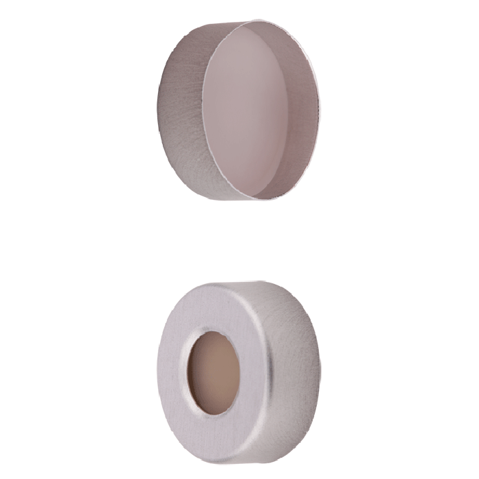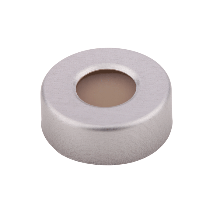 Caps, Headspace, Crimp Top, with Natural Silicone Rubber / Natural PTFE (10mil), High Purity Septa, fitted in Aluminum, Silver Caps with 10mm center holes. For use with 20mm Crimp Top Headspace Vials. BASIK Brand. 100/PK.