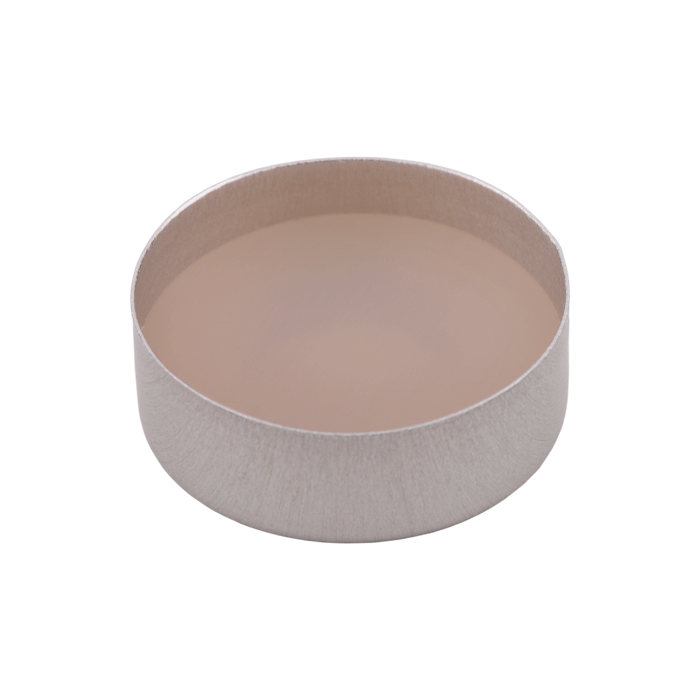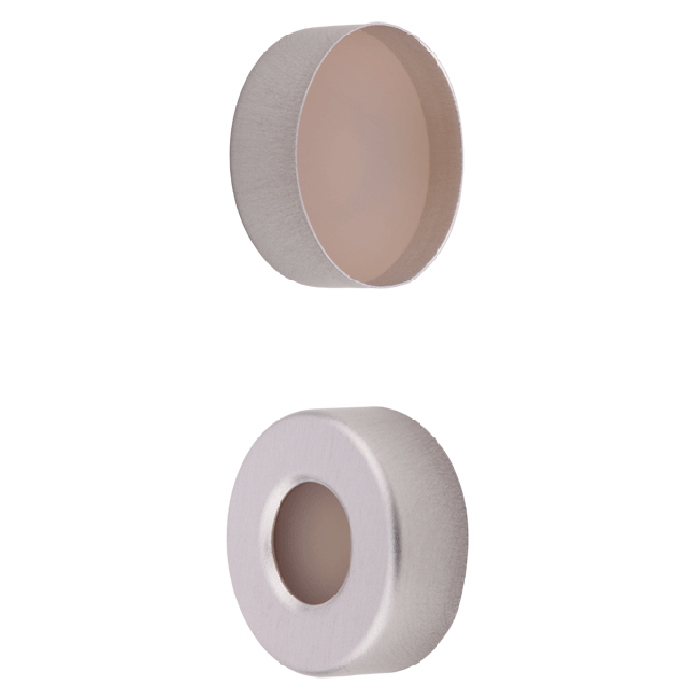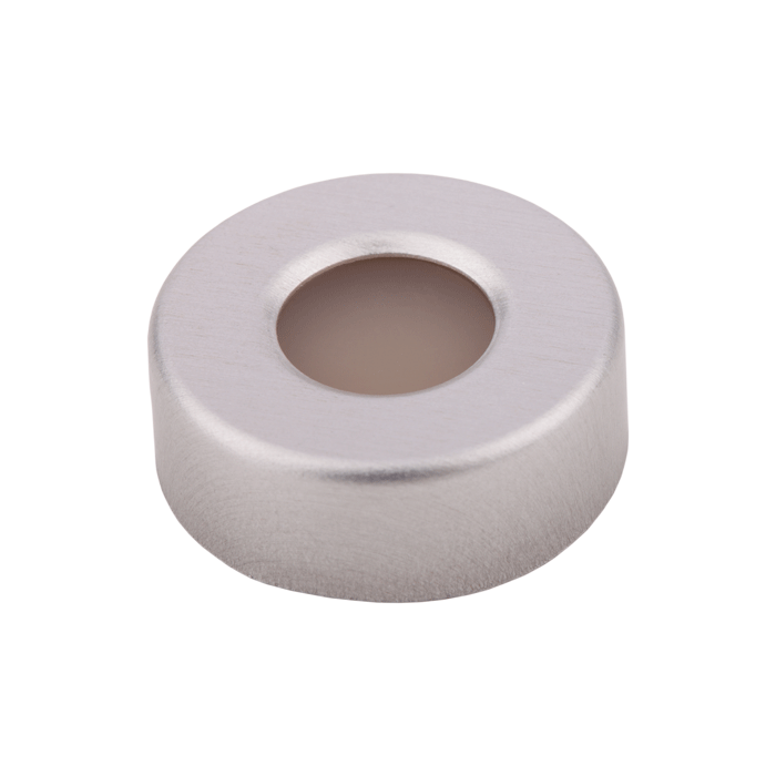 Caps, Headspace, Crimp Top, with Natural Silicone Rubber / Natural PTFE (5mil), High Purity Septa, fitted in Aluminum, Silver Caps with 10mm center holes. For use with 20mm Crimp Top Headspace Vials. BASIK Brand. 100/PK.